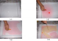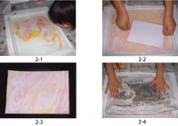 2−1 吹いて混ぜてもOKです。 2−2 紙を水の上にそっと 浮かべます。その後、 すぐに紙をそっと 持ち上げます。 2−3 出来上がり作品です。 2−4 使用後に水全体の上に 新聞紙を置いて、残った 色を吸わせます。 こうすればいちいち水を 取り替えなくても済みます。 濡れた新聞は絞っても水を 汚しません。